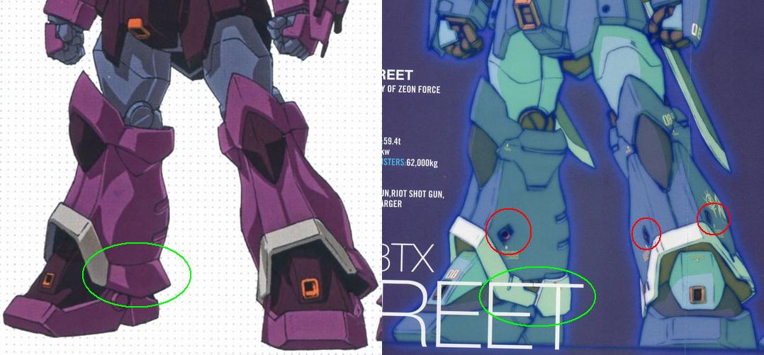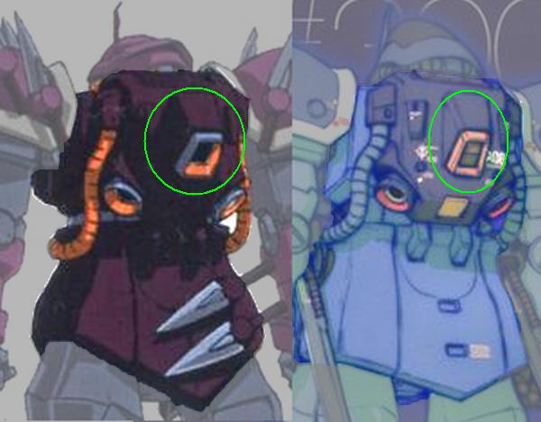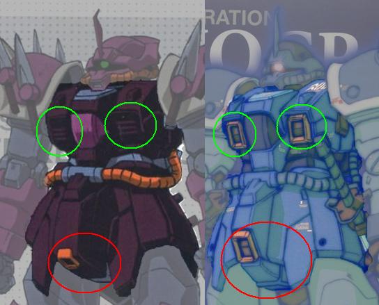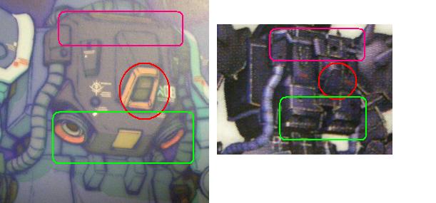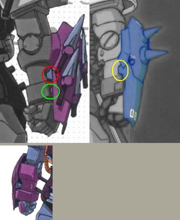 緑の丸…素イフの胸部ダクトが四角形なのに対し、シュナイドは、いわゆる連邦系MSの胸部ダクト(枡状の枠に板のダクト)と同じ構成のものになっています。ジオン系の機体でこのタイプなのはちょっと珍しい。ここが非常に気になる。