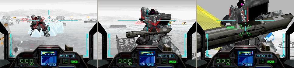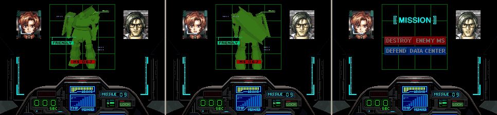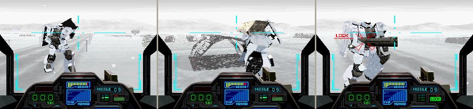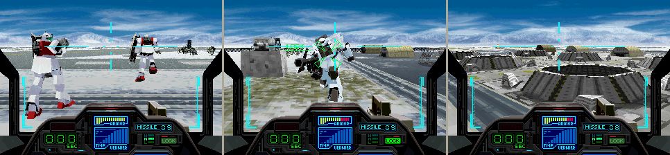 *その2:外伝3ステージ2ではゲーム中に雪が降り続ける演出があります。もしかしたら「先の戦闘でジムが破壊されたのでザクに乗り換えた」というストーリーになったのは、敵として登場するザクのデータを僚機にも流用することで読み込むデータを軽くし、サターンの処理能力でも雪が降る演出を可能にするためだったのかもしれません。