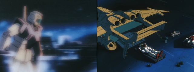 連邦軍のV作戦を調査したジオン軍側の報告、という内容。V作戦の正体は連邦製試作MS(ここではガンダム、ガンキャノン、ガンタンクを指す)による実践データの収集とそれをフィードバックした量産型MSの開発だということ。木馬の出現に前後して、前線で連邦の量産型と思われるMSの目撃が相次いでいることの報告です。報告の中に灰色のジム。場面が変わり、白&赤色(ジム・コマンドと同じ配色)の陸戦型ジムがミデアに搬入されているシーンが映ります。