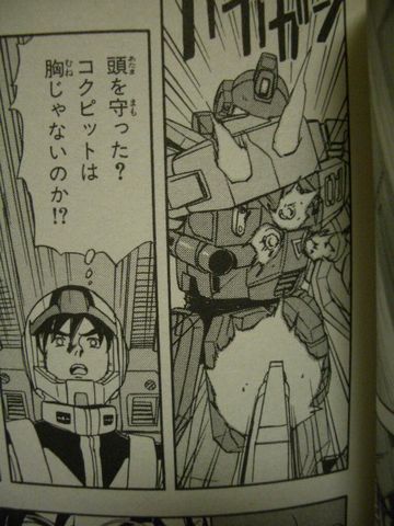 ユウはコックピットに向けてマシンガンを掃射するが、蒼いジムはコックピットではなく頭を守るという、奇妙な行動をとった。