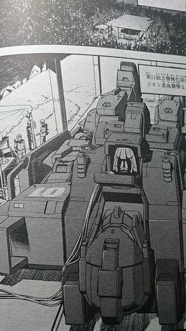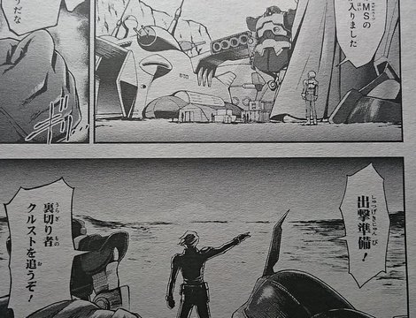 皆川版・・・開戦以前の哨戒中にザクと遭遇、翻弄されるもお互い発砲することはなかった。ここでユウはモビルスーツの恐ろしさと重要性に気づく。