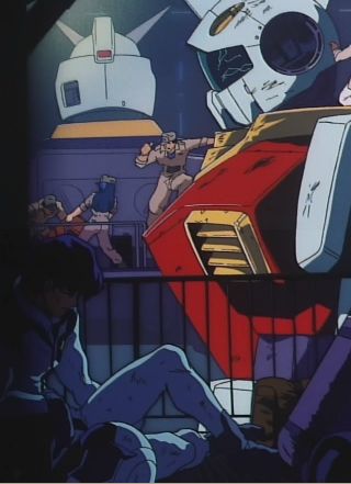 ②『ガルマの国葬』。整備ドッグでガルマの国葬、ギレンの演説のTV放送を眺めるユウ・カジマ。この画はガンダムウォーのカードでも使用されていました。