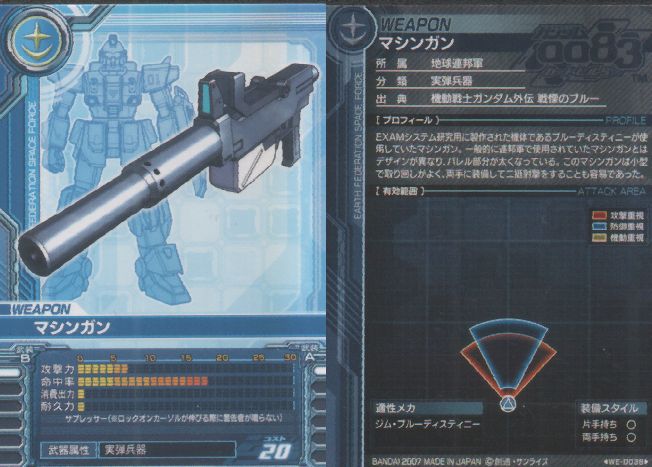 「EXAMシステム研究用に製作された機体であるブルーディスティニーが使用していたマシンガン。一般的に連邦軍で使用されていたマシンガンとはデザインが異なり、バレル部分が太くなっている」