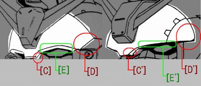 両機ともフロントアーマーの底辺を基準に太ももが描かれているが、